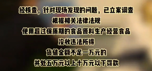 @徐汇市场监管 表示——经核查,对明呈黄鱼面馆现场发现的问题,已立案调查。根据相关法律法规,使用超过保质期的食品原料生产经营食品,没收违法所得,货值金额不足一万元的,并处五万元以上十万元以下罚款。