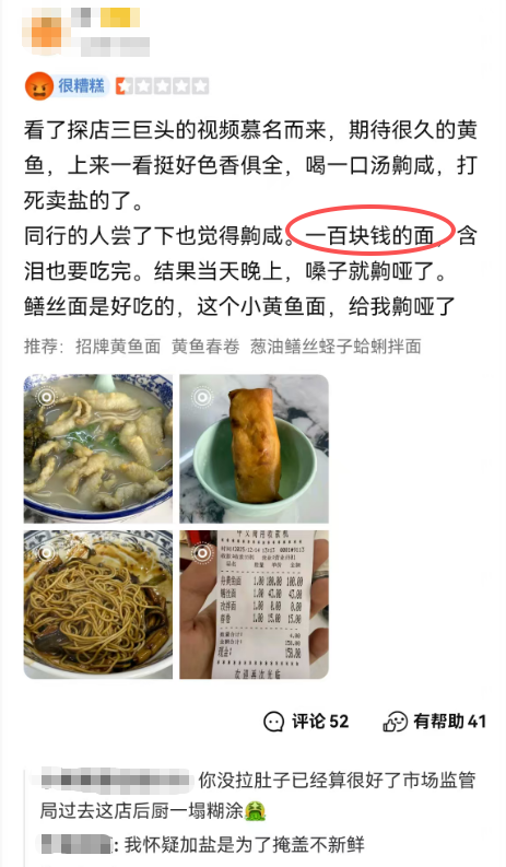 有网友表示刚吃过他家100元一碗的黄鱼面看到新闻曝光现在心情很复杂……