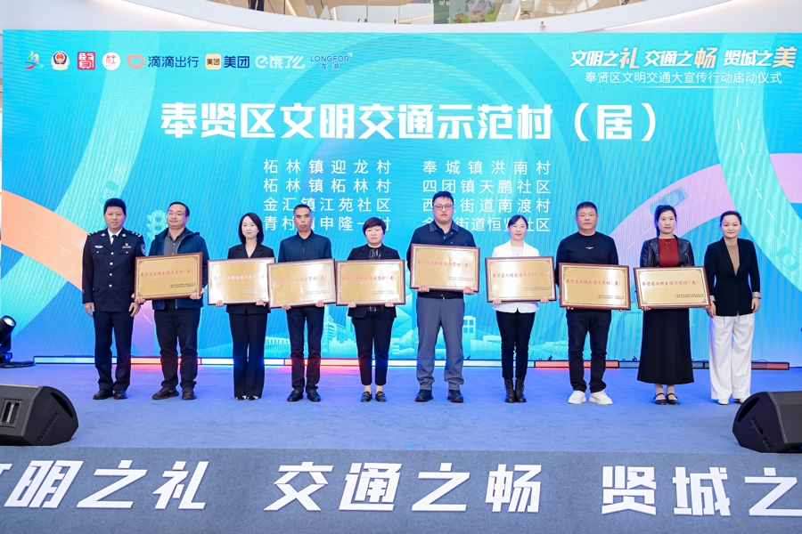 授旗环节,柘林镇迎龙村等8家在文明交通管理与宣传中表现突出的村居被授予“奉贤区文明交通示范村(居)”称号。迎龙村代表现场分享了“两站两员”建设和“网格化交通安全宣传”的实践经验,并向大众发出践行文明交通的倡议,展现了基层推动文明交通的积极成果和对文明交通建设的坚定承诺。