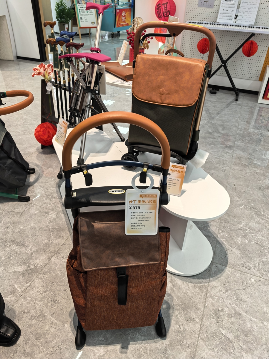 一旁的多功能小推车货架前,不少长者驻足体验。一款名叫“坐坐小拉车”的产品一周卖出了50多个。它看起来像普通的便携小推车,但按住卡扣、翻转车架,就变成了一把牢固的椅子。侧边加了挂钩,能稳稳挂在超市购物车边缘。对很多老人来说,去菜场的路突然变短了——走不动了,随时可以坐下;东西重了,挂上去也能省力。
