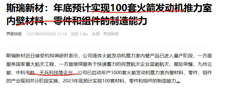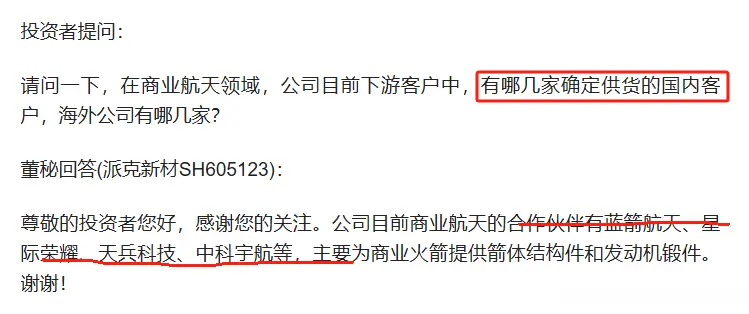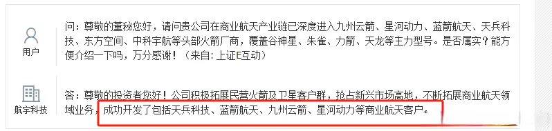 天兵科技供应商:公司液体火箭发动机推力室内壁产品已进入量产,服务于民营航天企业蓝箭航天、星际荣耀、九州云箭、中科宇航、天兵科技等企业。