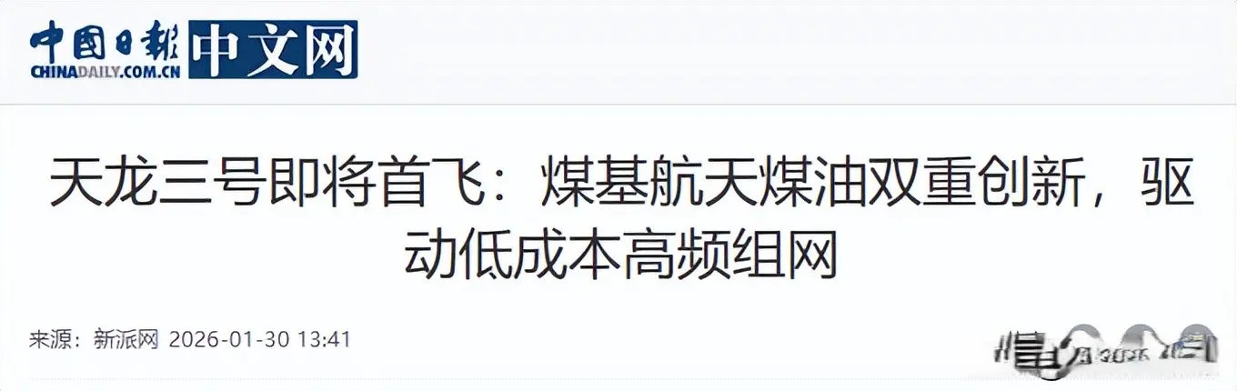 1月30日,中国日报中文网报道了,天龙三号即将首飞:煤基航天煤油双重创新,驱动低成本高频组网的消息。天龙三号这次主打可重复使用回收火箭,这次首飞意义重大。