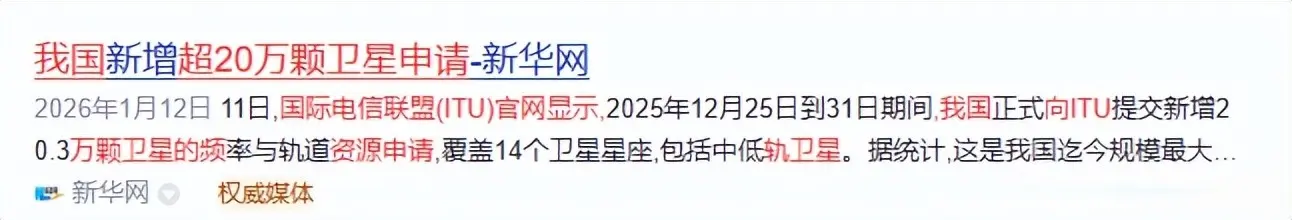 2025年12月31日,国际电信联盟(ITU)官网显示,我国向ITU申请了超20万颗卫星的频轨资源。