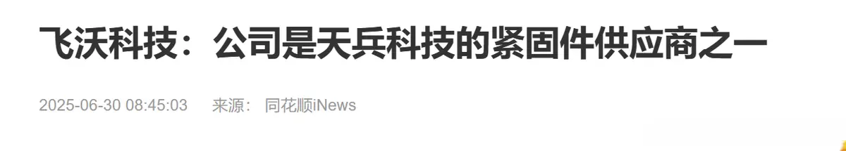 天兵科技供应商:公司产品已用于商业火箭及火箭发动机所用紧固件,是天兵科技的紧固件供应商之一。