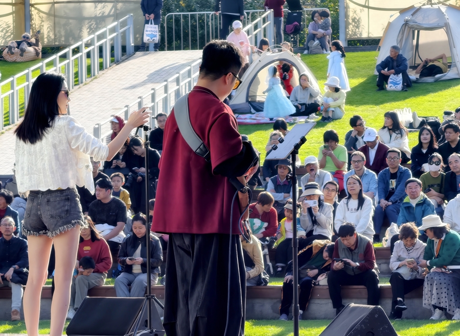 在露天音乐广场,乐队带来的流行乐、爵士乐与灵魂乐等多元曲风歌曲,吸引了众多市民游客前来,扇形草坪上坐满了听众,气氛轻松热烈。