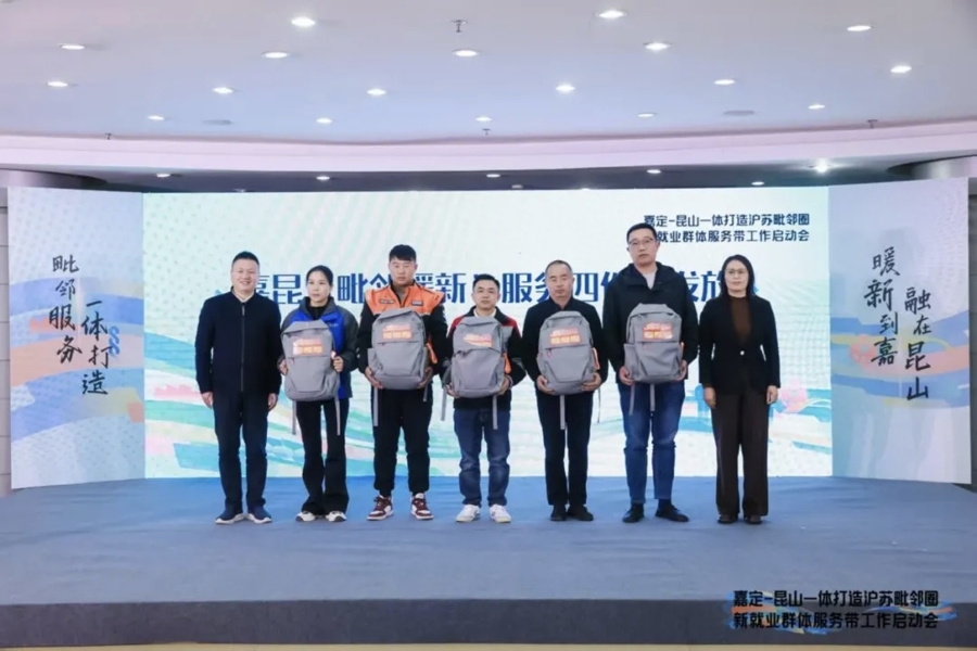 同步发布的“嘉定—昆山一体打造沪苏毗邻圈新就业群体服务地图”以312国道为轴线,串联起已建成的38个服务点位,构建了“24小时基础保障圈、15分钟生活便利圈、8小时治理参与圈”三个服务圈层,并整合推出涵盖健康、法律、技能、心理等维度的“暖心服务七项支持”服务包。现场还特别推出包含“助力包、报到码、心愿卡、节节拍”的“毗邻暖新”服务四件套,为新就业群体送上贴心关怀。