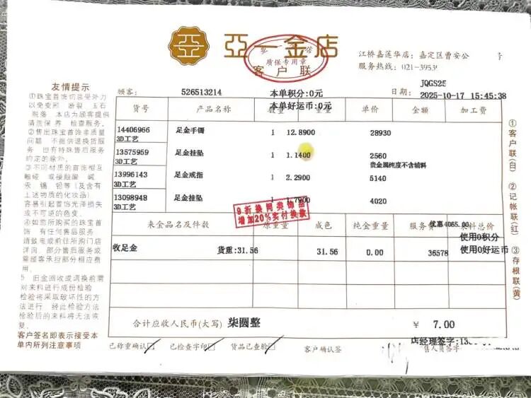 深夜,白天在亚一金店江桥嘉莲华店,和母亲一起将自己款式老旧的金饰品换成新款的钱女士,越按计算器,越想越觉得不对劲。